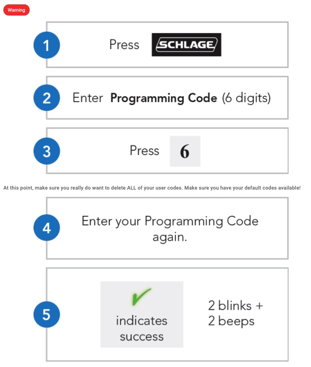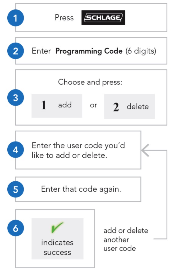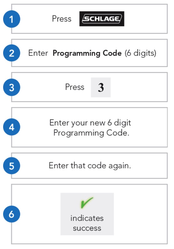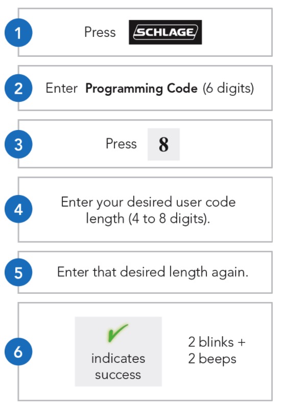 The Schlage Connect lock comes with a six-digit programming code and two user codes pre-installed. The user codes can be programmed to be from four to eight digits long but they must all be the same length for your lock.