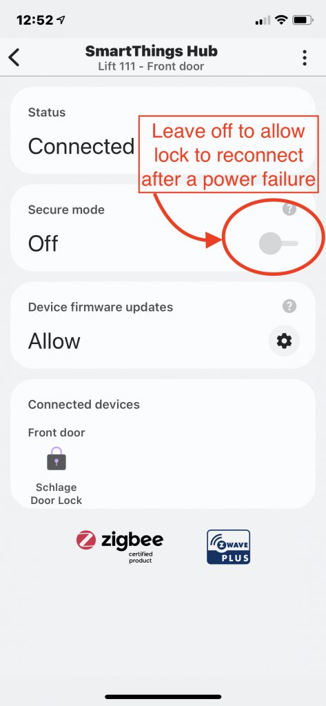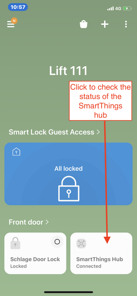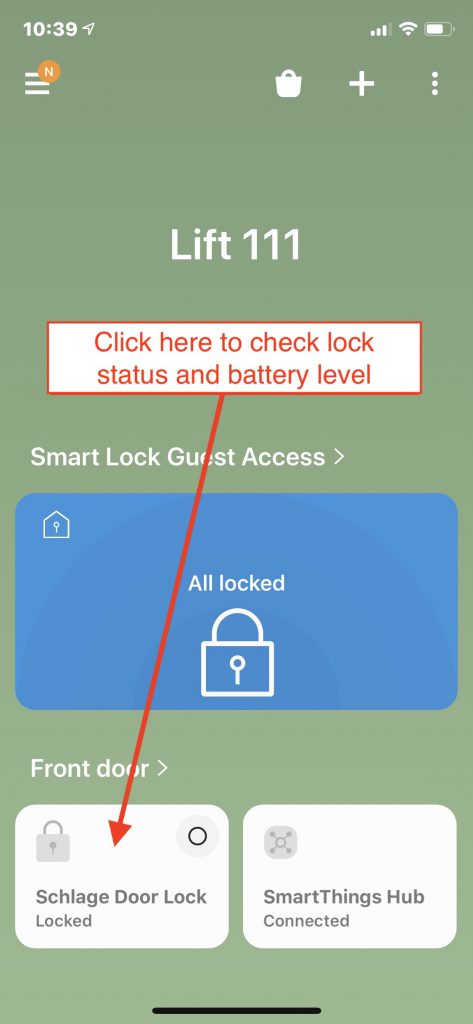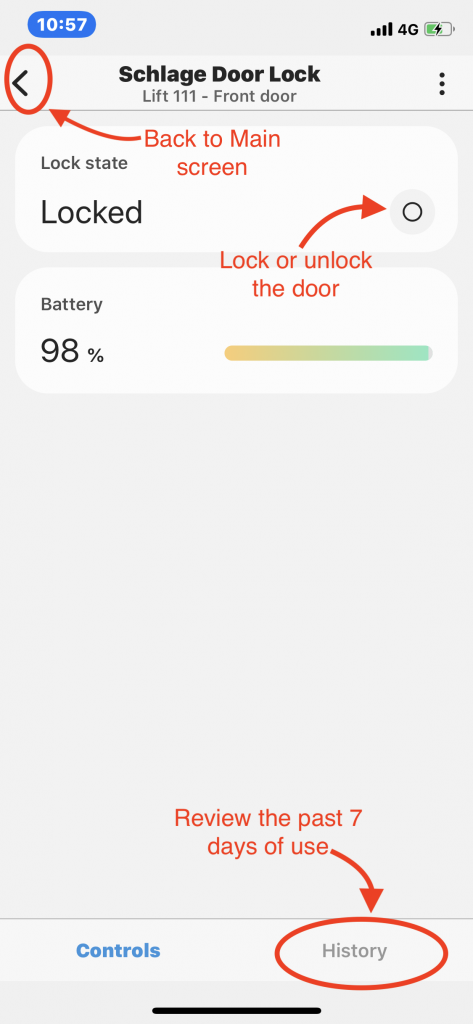 From this page on your device you can lock or unlock your door, check the battery level, and see the last seven days of lock use.